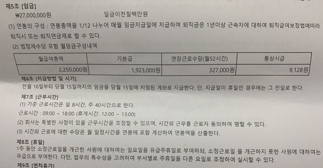2. 주 5일제 근무라면, 해당 근로계약서상 연장근로수당은 실제 연장근로를 하지 않아도 지급되는 고정연장근로수당으로 보아야 할 것입니다. 즉, 월 52시간의 표기는 오기로 판단되며, 엄밀히 따지면 월 23.7시간으로 표기해야 할 것입니다(327,000원/9,200원/1.5). 다만, 실제 월 52시간의 연장근무를 하고 있는 것이라면 9,200원*52시간*1.5 - 327,000원 = 390,600원을 추가적으로 청구할 수 있습니다.