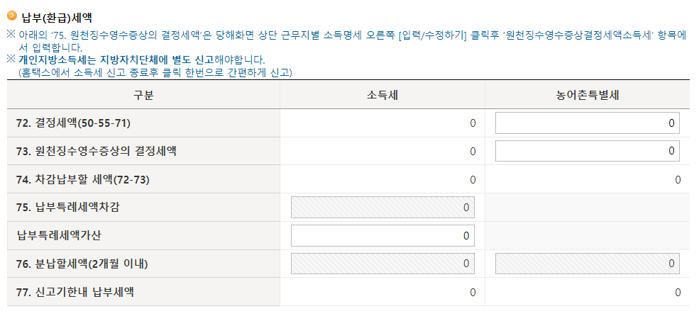 하단 납부(환급)세액에 아무것도 뜨지 않고