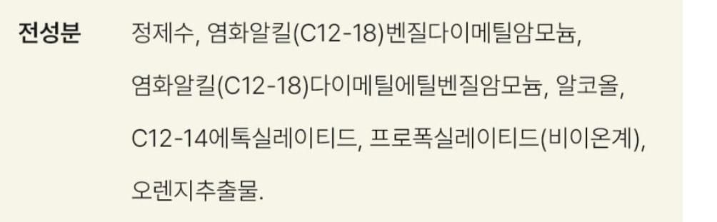 염화알킬(C12–18)벤질다이메틸암모늄, 염화알킬(C12–18)다이메틸에틸벤질암모늄: 강한 살균·소독 성분(4급 암모늄 화합물)으로 피부·점막 자극 가능성이 있습니다. 장시간 접촉이나 반복 노출 시 접촉성 피부염 위험이 있습니다.