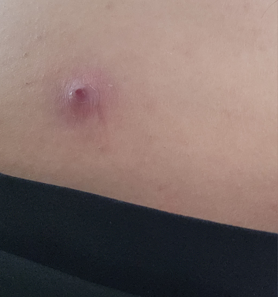 허벅지 밑에 이런 트러블이 생겨서 짰는데 피지가 조금 나온 뒤로 가라앉지가 않아요 피하낭종인가요? 에스로반을 발랐는데 차도가 안보이네요