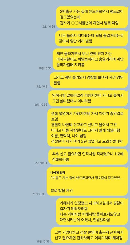 가해자가 욕한거 인정한다고 경찰 통해서 들었는데 발로 찬거는 들었는지 기억은 안나요