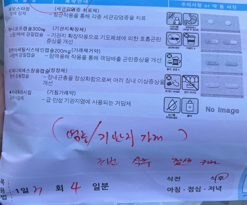 1. 드시는 약 중에 콧물약은 없습니다. 기관지약과 기침가래를 제거하는 진해거담제 위주로 되어 있습니다.