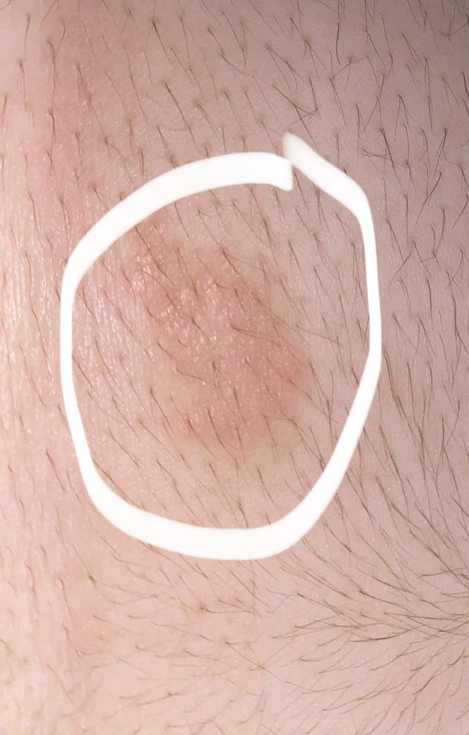 비특이적인 피부증상이나 국소 알러지반응 의 가능성이 있으며 드물게 진균감염이 있을수 있습니다. 자연적으로 호전되는 양상이라면 경과를 보셔도 될것으로 사료되나 점차 악화양상을 보인다면 피부과진료를 보시기 바랍니다.