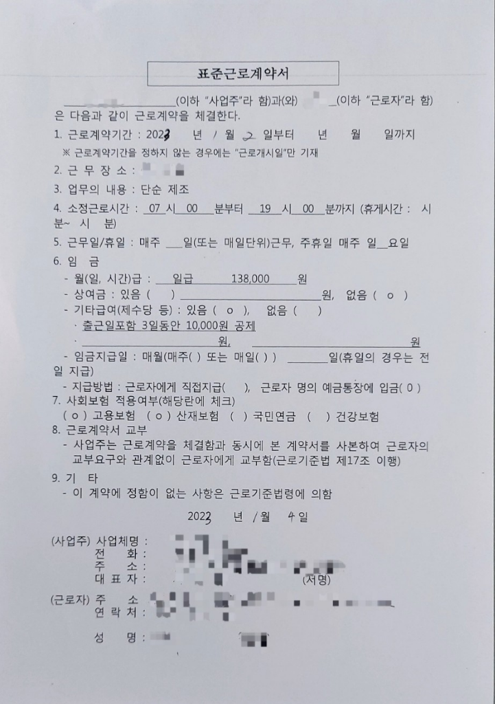 3일째 되는날 근로계약서를 작성했는데 뭔가 이상했습니다. 사진에 보이는 것처럼 근로기간, 근무일, 임급 지급일, 휴게시간이 정확히 명시가 되어있지 않았고 사업주의 서명 또한 되지 않았습니다. 이후 서면 교부를 받지 못했습니다.
