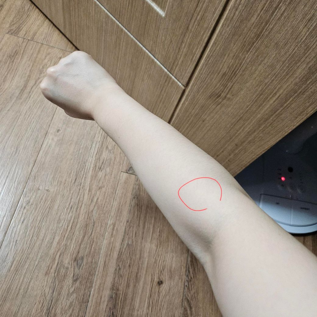 우선 사진속 해당 부위는 전완근의 부위이며 정확한 촉진이 필요하지만 전완근의 신전근 부위로 보여집니다.