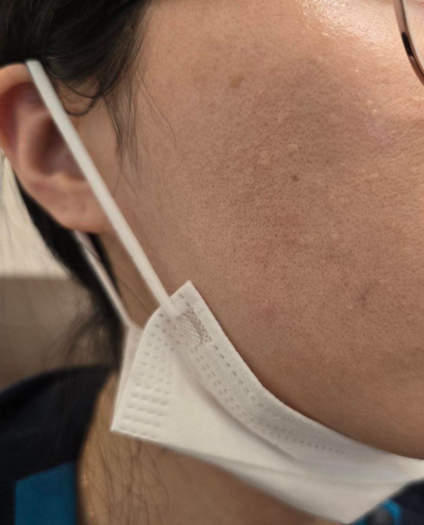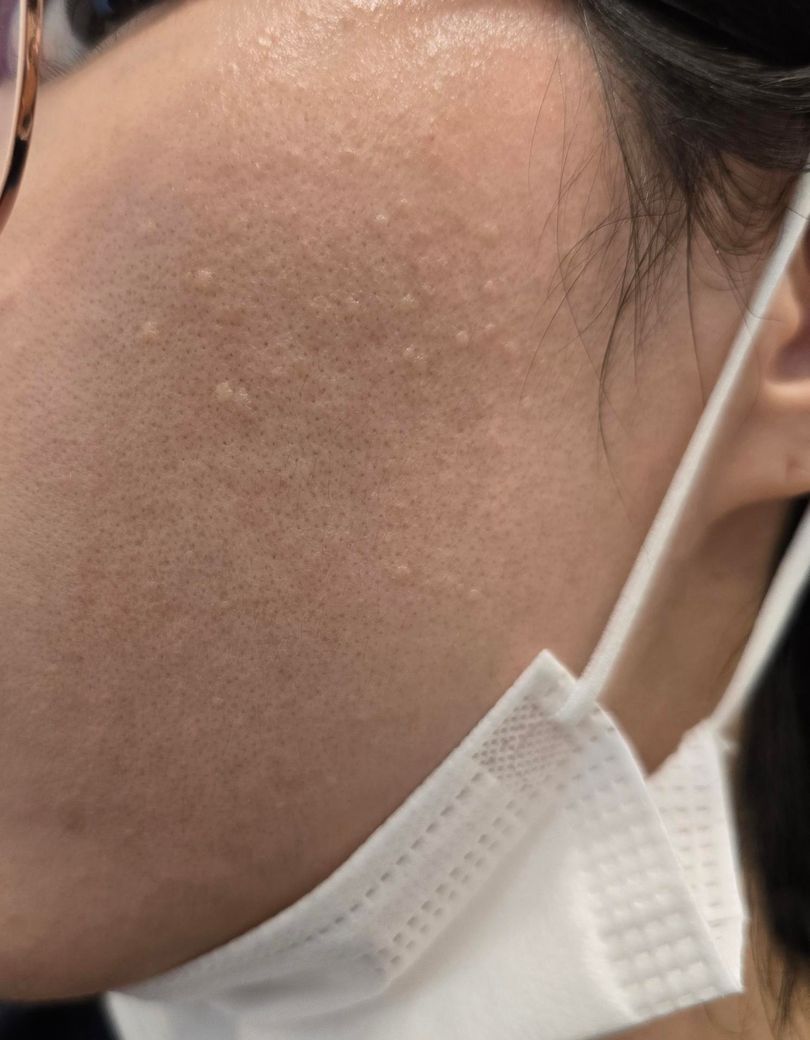 사진상으로는 볼 전반에 균일하게 분포한 1mm에서 2 mm 정도의 피부색–연한 황백색 구진들이 관찰됩니다. 표면은 비교적 매끈하고 염증성 홍반은 거의 없습니다.