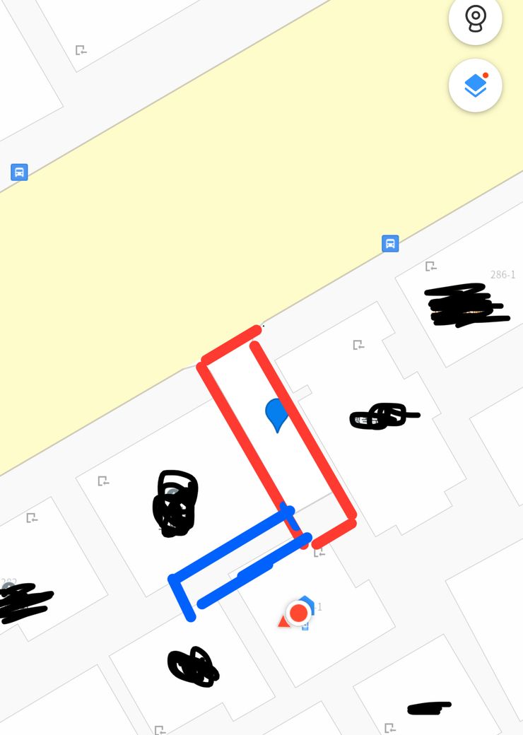 근데 문제는 해당 건물이 건물 뒷편, 저희집 담장과 건물사이 공터를 주차구역으로 이용하고 있다는겁니다(파란색 네모).
