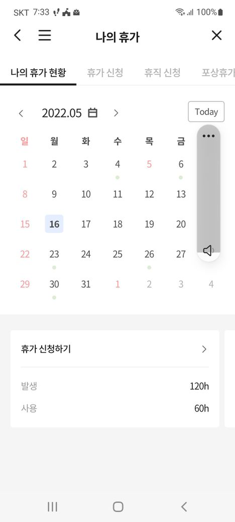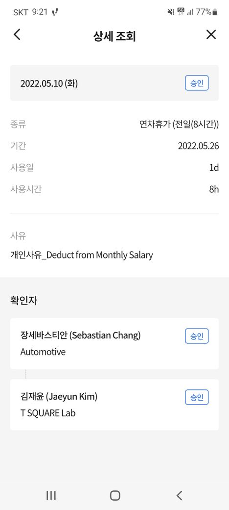 대표이사님께서 당해년도 만근이 아니라 연차 사용이 불가하다고 승인해주지 않으셨네요. 그후 기존에 올려 승인 받은 것과 개인적으로 연차를 써야해서 급여에서 일당 제하는 것으로 연차 2개를 올려 승인 완료 하고 나니 7.5개의 연차가 남았습니다.