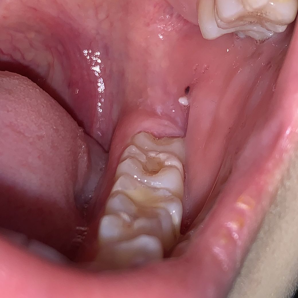 아래 쪽에 부분매복된 사랑니로 인해 해당 부위의 볼이 씹히면서 점막에 손상이 생겨 발생하게 된 것으로 보입니다.