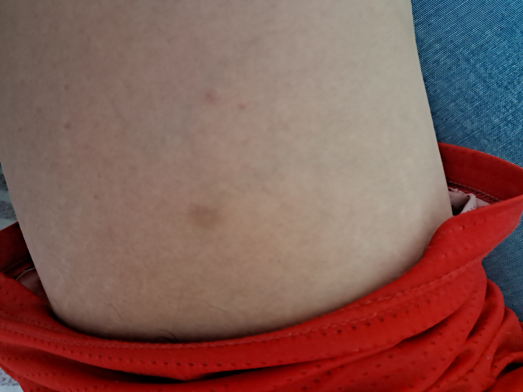 현재 상태로 보아 이전에 찰과상 등에 의한 가벼운 상처가 회복되는 과정 중의 피부로 보입니다. 증상이 별도로 없으시다면 병원을 가실 필요는 없겠으나 만일 병변이 점차 커지는 양상이고, 검은색으로 변한다면 근처 피부과에 가셔서 의사의 진료를 받아보시기 바랍니다.