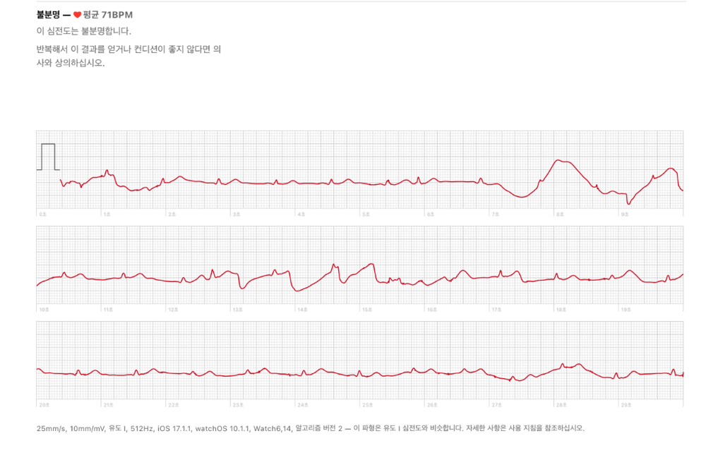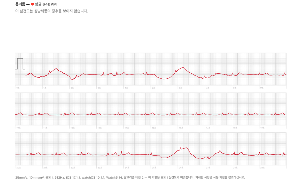 제공된 단일 lead 심전도로 정확히 판별이 어려우나 큰 이상이 있는 심전도는 아닐 것으로 사료됩니다. 증상이 지속되신다면 12 lead 심전도를 검사해보시기 바랍니다.