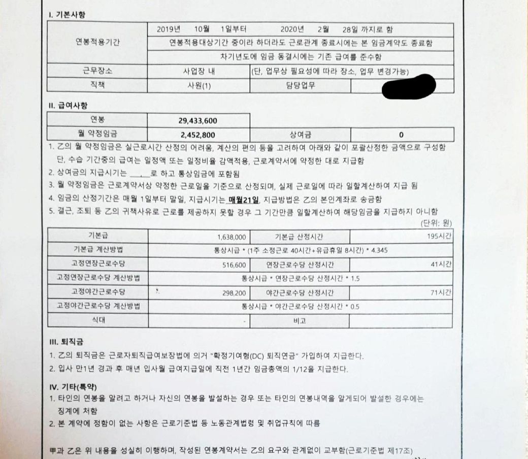 현재 2조2교대 (4일 주간근무, 2일 휴무, 4일 야간근무 2일 휴무) 하고 있고 , 19년 9월에 하기의 연봉계약을 했습니다.