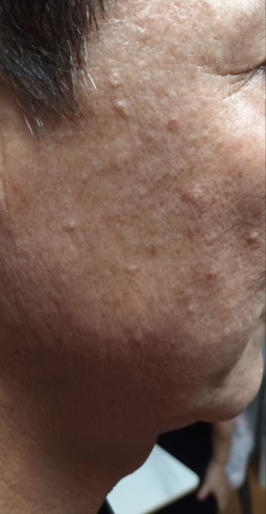 편평 사마귀 가능성이 있습니다. 계속 늘어가는건 퍼지는거구요. 그 외에도 각화증, 피지낭종, 또는 두드러기 등이 있을 수 있습니다.