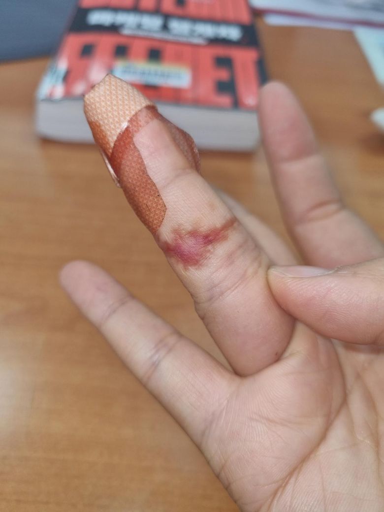 손가락 끝을 베여서 봉합수술을 진행했습니다.2바늘 정도 꼬맸구요ㅠㅠ 문제는 손가락 끝이 아니라 손가락을 감아준 붕대에 압박 때문인지 손가락 중간에 빨갛게