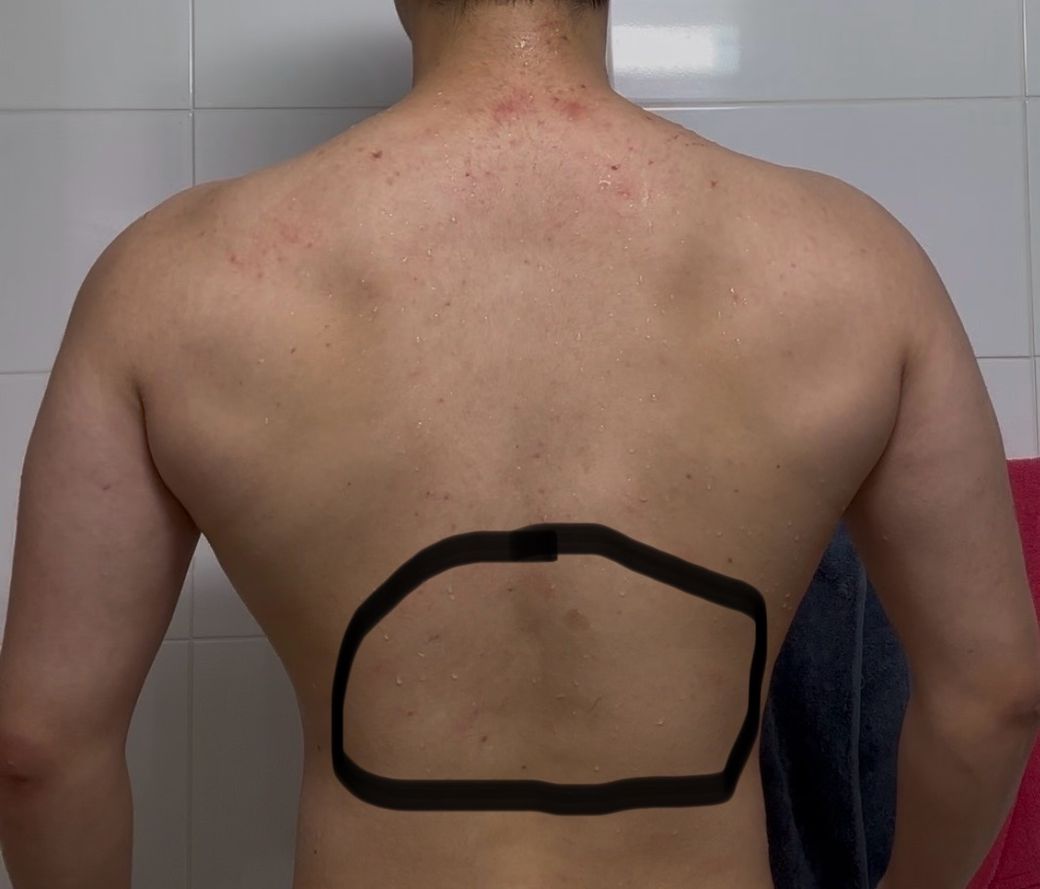 척추뼈나 갈비뼈 골절일 가능성을 완전히 배제할 수는 없지만 골절의 경우 부러진 부위만 아프지 사진으로 표현해주신것과 같이 넓은 범위에 통증이 발생하지 않습니다.