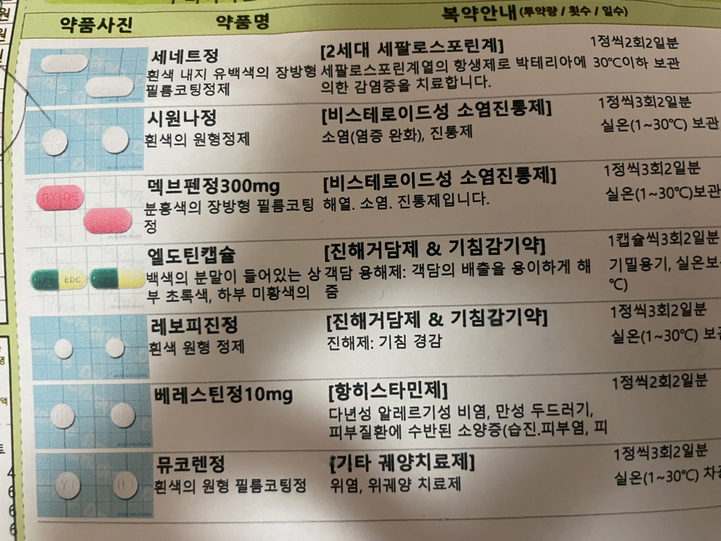 시원나랑 덱브펜은 둘 중 하나만 드세요. 둘은 같이 먹을 수 없는데 처방이 나왔네요.