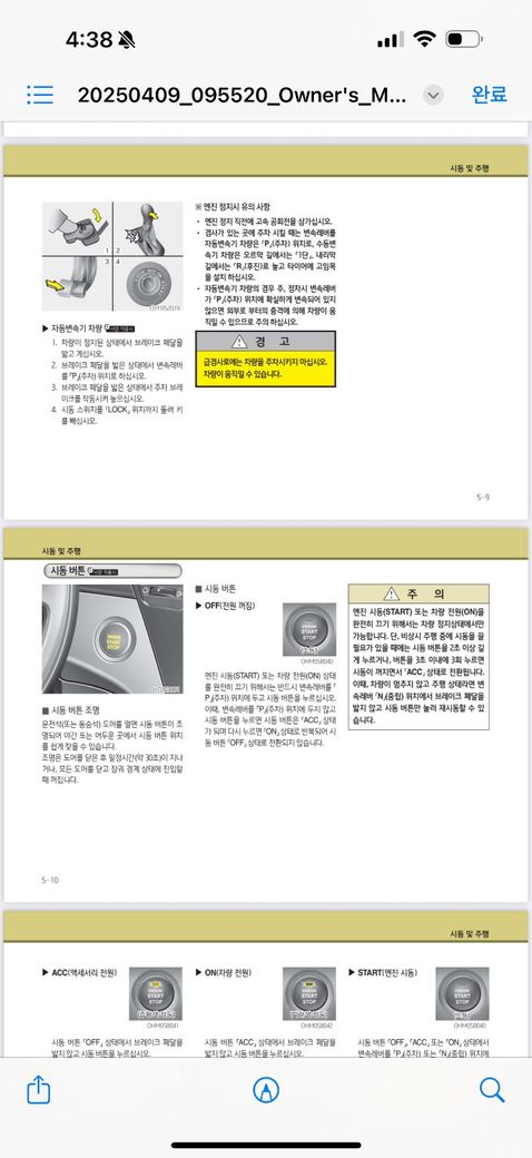 사진에 보시면 시동을 완전히 끄기 위해서는 변속 레버를 p단에 넣고 시동 버튼을 눌러야 전원이 완전히 꺼진다고 되어있는데