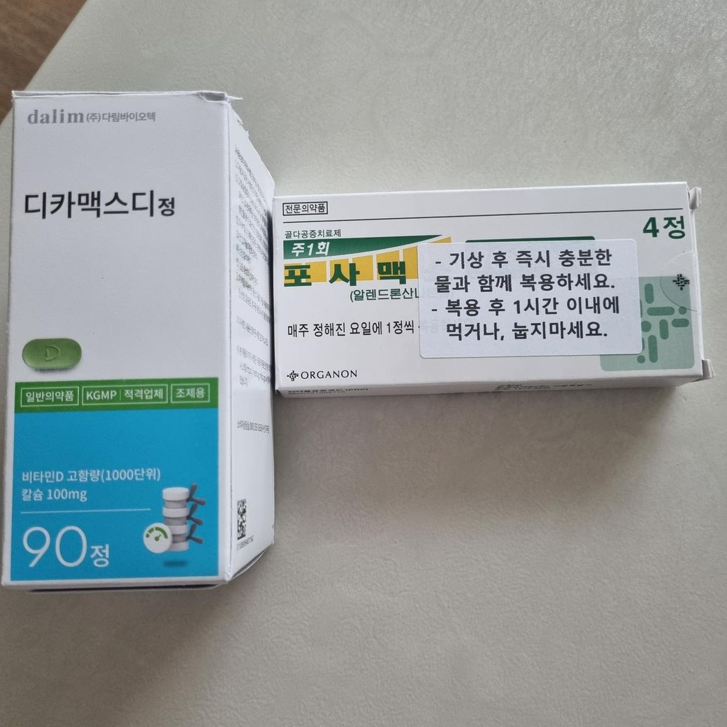디카맥스디정은 매일아침1알 ,포사맥은 주1회 일어나자마자 1알 먹고있었요