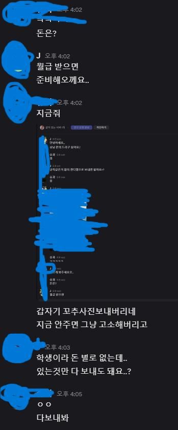 디스코드에서 한 서버에 들어가 방장이 개인메시지로 상납을 받겠다면서 성기 사진을 서버원에게 요구하길래 개인메시지에서 인사 몇마디 후 사진을 보냈는데 이 화면을 캡처하여 저에게 보낸 후 고소를 하겠다며 돈을 요구하는 상황입니다. 정말 고소가 되는지 걱정입니다..ㅠ