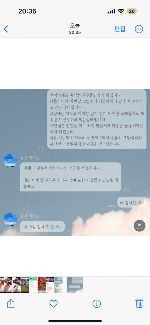 아무 말씀이 없어 사장님께 얘기를 했더니 월급 20만원을 올려주시겠다 혼자 근무하라 라고 하셨는데
