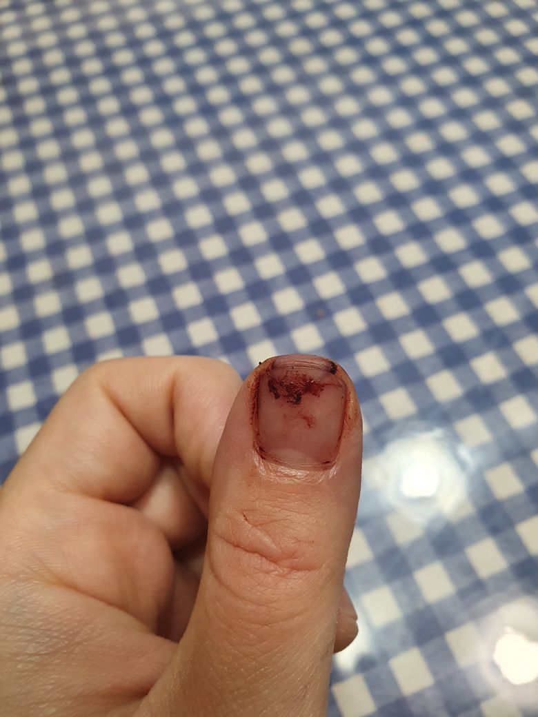 요리하다가 식칼에 손 끝이 반달모양으로 도려내듯 손톱과 함께 베였습니다. 완전 떨어진게 아니라 상처부위 왼쪽에서 오른쪽으로 80% 정도 칼이 들어갔네요.