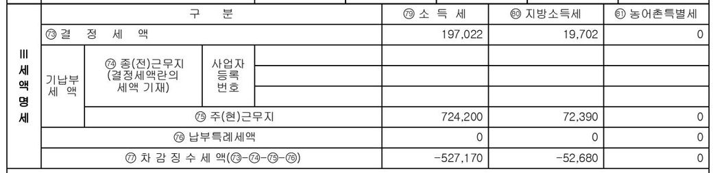24년 근로소득 원천징수영수증에는 기납부세액이 724,200원으로, 환급받아야 하는 세액은 527,170원 입니다.