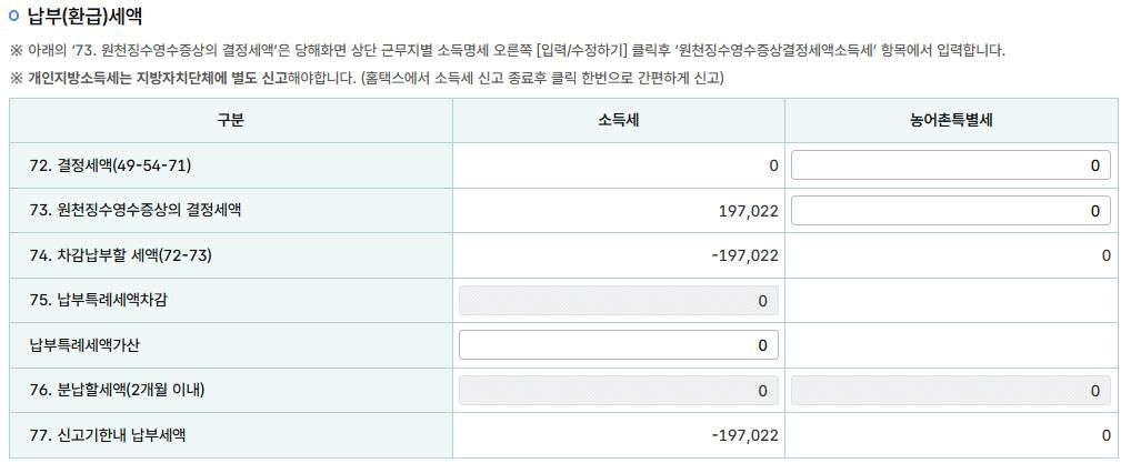그런데 금번 종소세 신고기간에 근로소득세를 신고하는 과정에서, 기납부세액이 아니라 결정세액을 기입하게 되어있어 결국 제가 최대로 받을 수 있는 환급액은 결정세액만큼의 금액으로 197,022원 입니다.