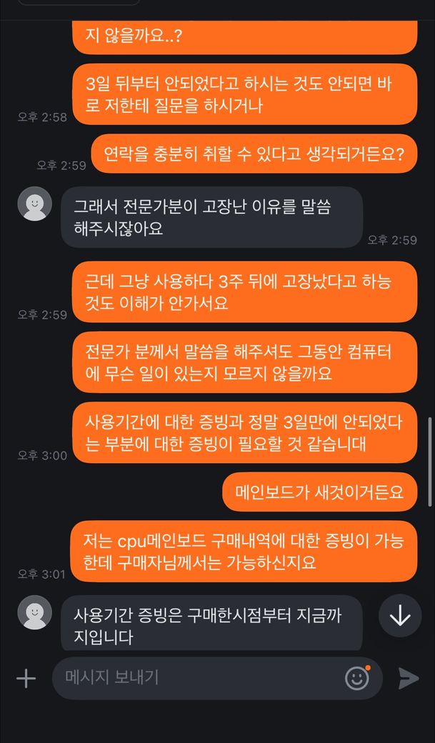 컴퓨터를 업글하면서 남은 그래픽과 SSD에 새 씨피유와 메인보드를 사서 중고로 판매를 하였습니다 조립은 한달 전에 했고 윈도우 정상설치와 작동을 확인한뒤 보관하다가 판매를 하였습니다 판매하는 당일날에도 작동을 확인했구요 그런데 3주뒤에 구매자가 컴퓨터가 고장나서 메인보드를 갈아야 한다고 메인보드를 잘못 조립하였다고 수리비를 달라고 하는데 제가 주어야 하는 의무가 있나요? 저는 정상작동을 해서 판매를 했고 구매자는 구매한 뒤 3주가 지난 후에 연락이 왔습니다