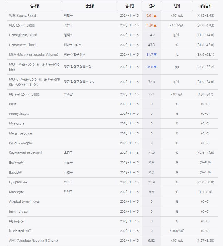 딱히 의미를 부여할 만큼 이상한 소견이 있는 수치는 없어 보입니다. 백혈구와 적혈구가 정상 범위보다는 살짝 높긴 하지만 크게 의미 없어 보입니다.