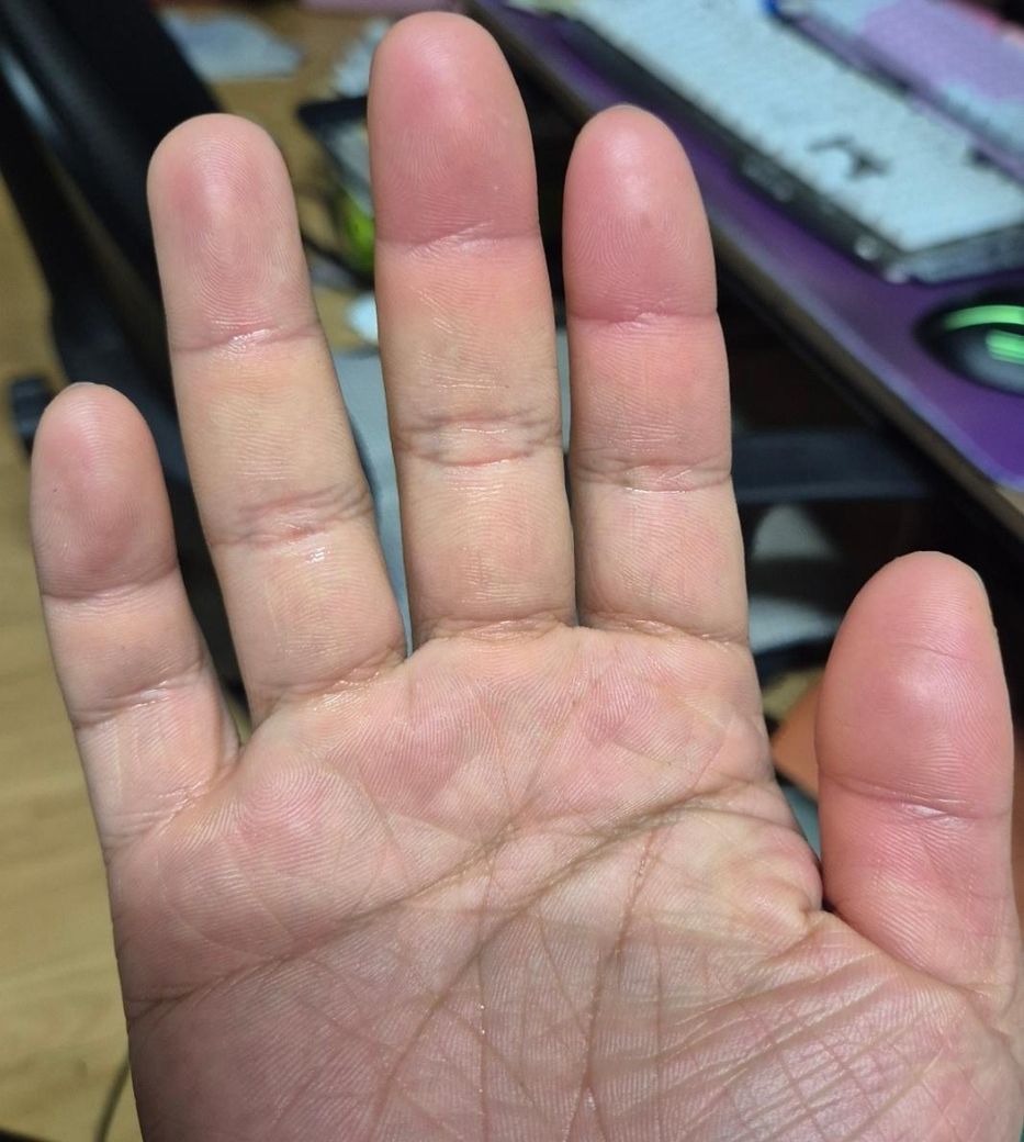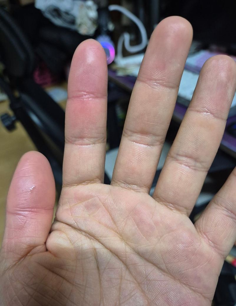 손 발가락이 붓고 쓸린느낌 빨간 부분은 열감이 있고 안빨간부분은 차가워요 띵띵부은 느낌이고 따뜻한 차를 마시면 동상 걸린것 마냥 거 뜨거워요