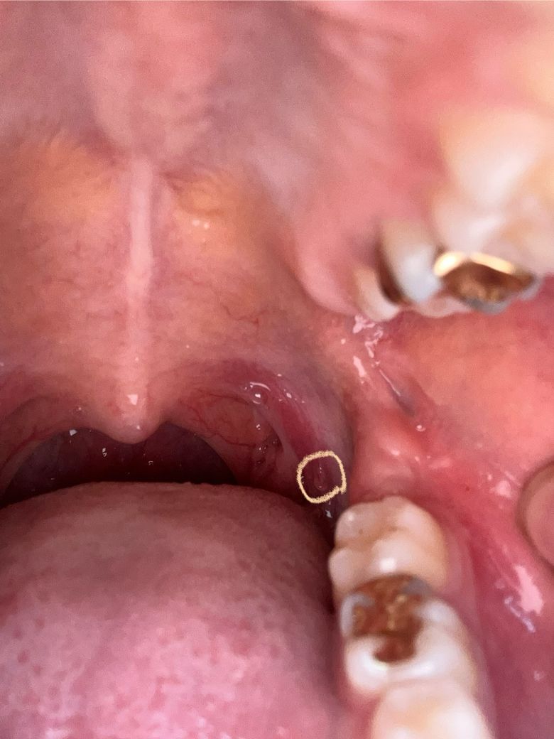 동그랗게 친 부분이 점막이 동그랗게 튀어나온것처럼 되어있는데 편평유두종인가요? 좀 혀에 있는 설편도..?같은 성곽유두인가 그런거랑 비슷하게 생겼어요 이게 뭔가요?