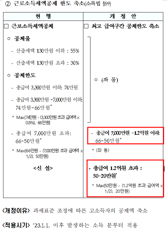 '23년도 이후 발생하는 근로소득부터 근로소득세액공제가 변경이 됩니다. 최고급여구간의 공제한도가 축소된다고 이해하시면 됩니다.