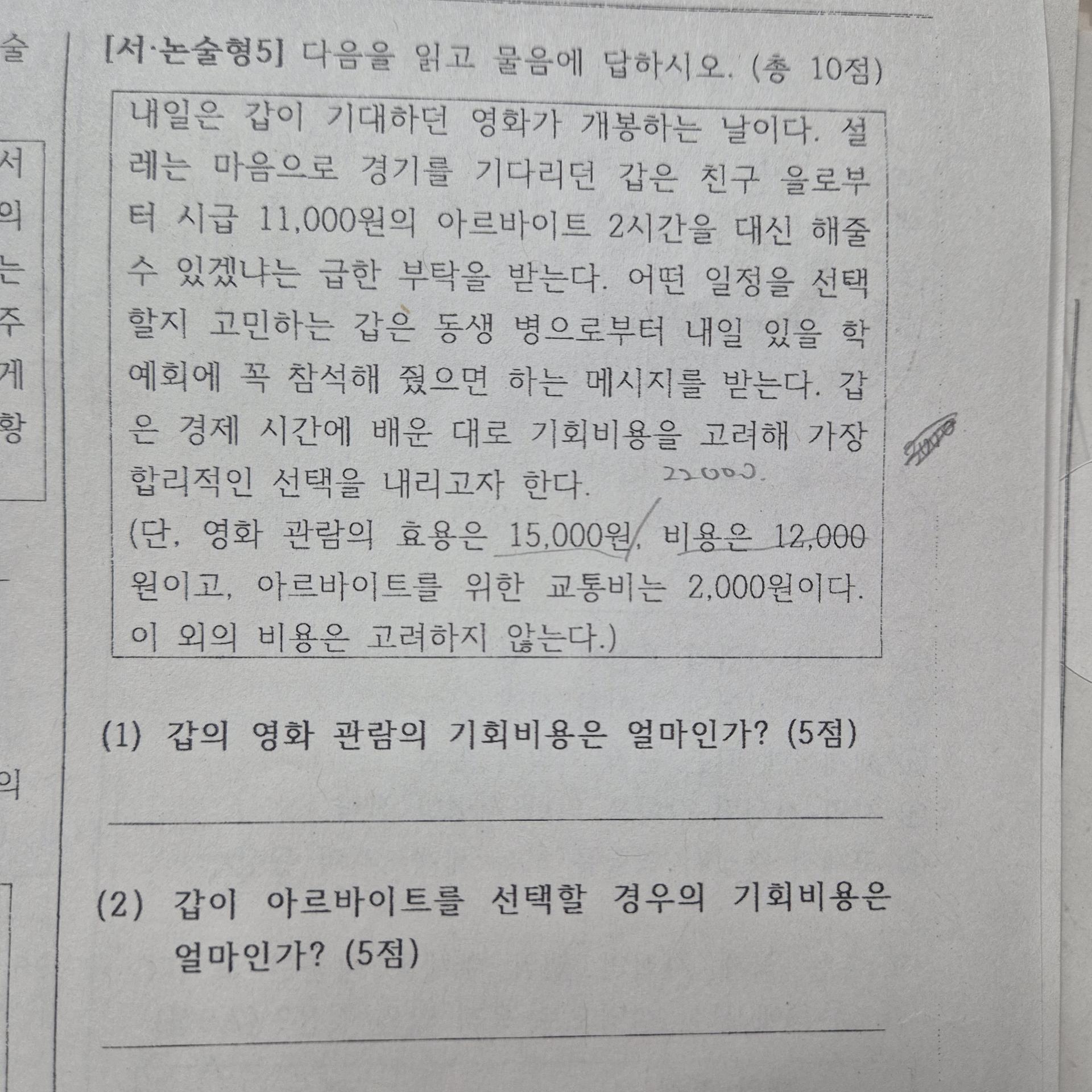 1. 갑이 영화 관람을 하게 될 경우 기회비용은 아르바이트를 해서 얻을 수 있는 기회비용을 산출을 하면 되는데