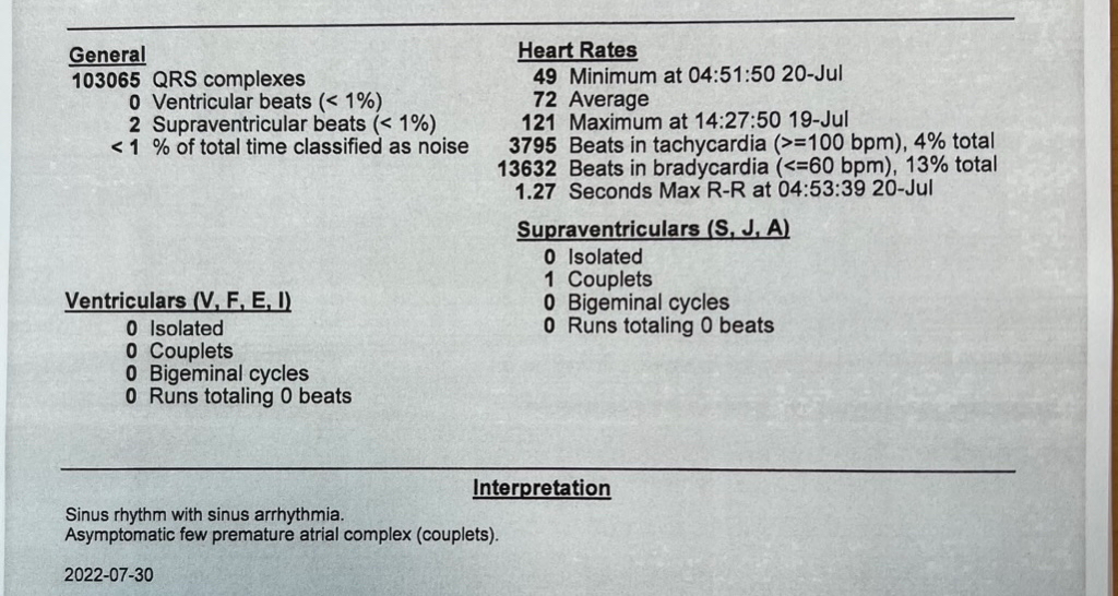 동성 부정맥은 빈맥, 서맥을 의미하는 것으로 보이고, 심방조기수축은 24시간 중 2번입니다.
