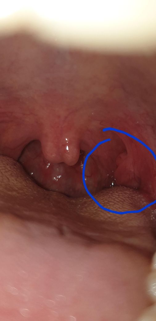 비대칭적으로 좌측 편도에만 연부 조직 비대가 확인되네요.