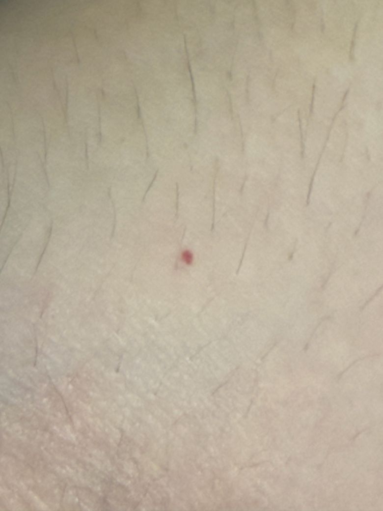 감별해야 할 다른 경우로는 작은 점상출혈(외상이나 압박 후 생김), 벌레 물림 초기, 또는 드물게 혈관성 병변 등이 있으나, 현재처럼 단일 병변이고 증상이 전혀 없으면 임상적으로 의미 있는 질환일 가능성은 낮습니다.
