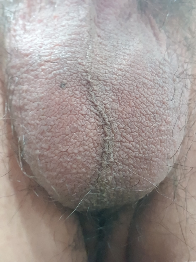 말씀하시는 고환 가운데의 검은줄 같은 것은 단순히 봉합선입니다. 즉, 양측 고환을 연결하는 부위에 원래부터 있는 일종의 선입니다. 성병과 아무런 관계 없으며 걱정하실 필요 없습니다.