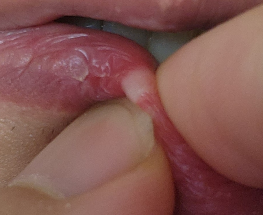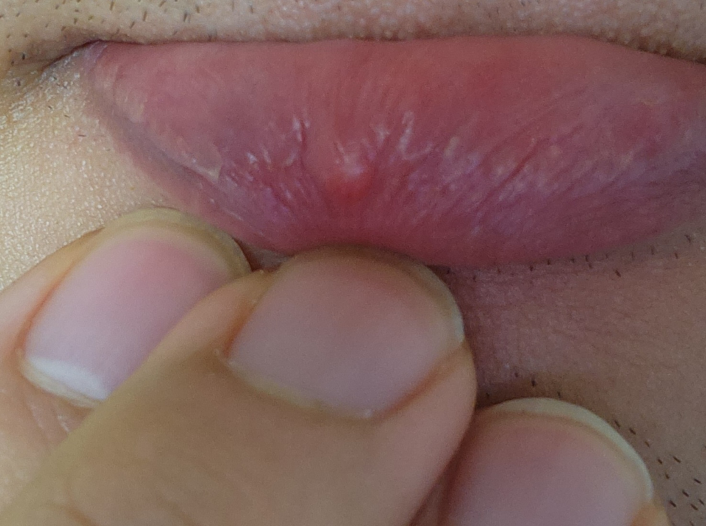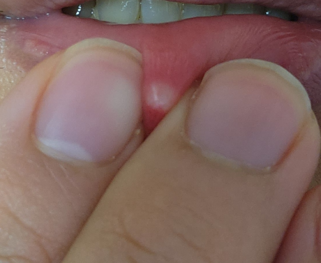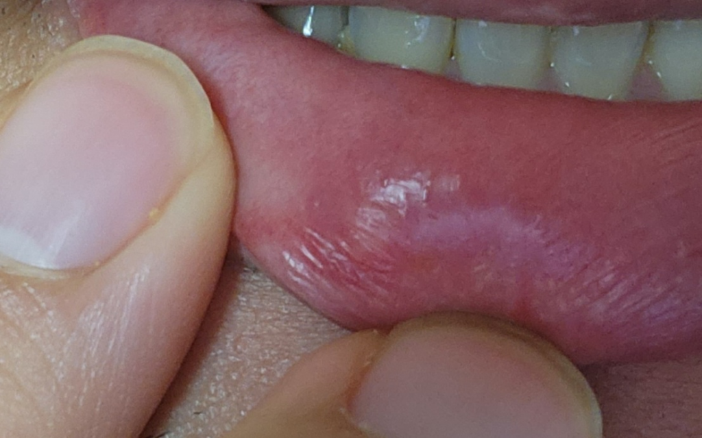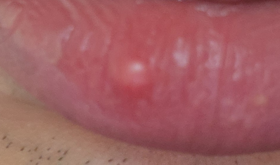 입술 안쪽으로 염증이 발생한 후 빠져 나가지 못하면서 피지 낭종이 발생한 상태입니다.