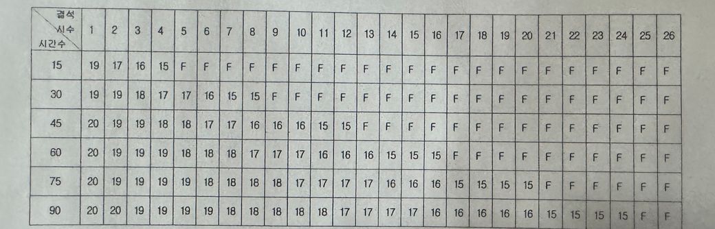 3학점이구요 일주일에 2시간씩 2번, 총4시간 수업입니다. 사진에 나와있는 출석 점수 계산표가 헷갈려서 그러는데 지금 4번 결석하였는데 저 표대로라면 출석점수 15점이 맞는건가요?
