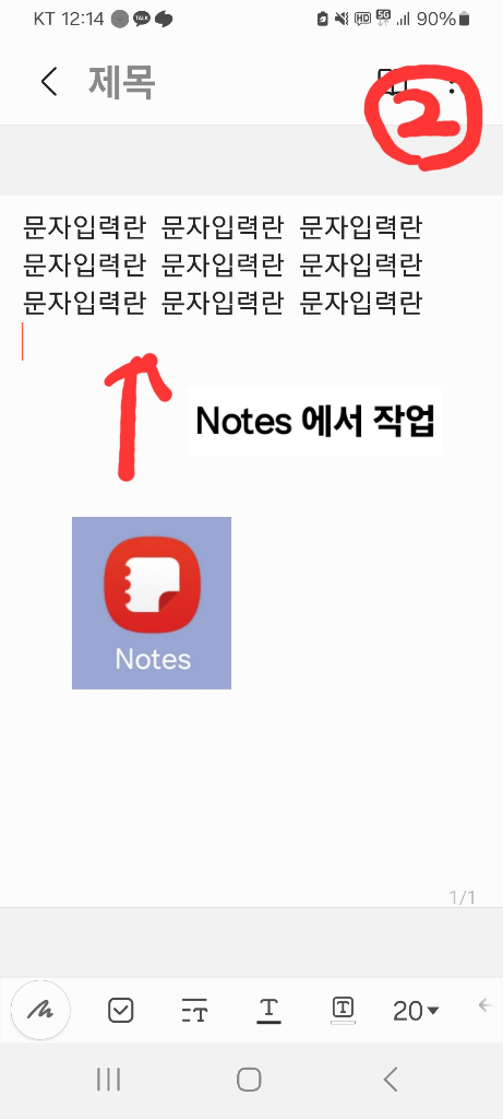 갤폰 A33. KT 사용중. 문자 보낼때 수신인 입력 후 본문 입력란에 문자 본문 입력하는데 사진1. 에서 보듯, 글꼴 자체는 크고 문자 입력창은 작으므로 장문 MMS 경우에는 어느 정도 문장 전체의 윤곽을(내용) 보면서 작성할 필요성도 있는데 입력창에 보이는 입력 문자는 아주 작은 량이므로 많이 불편합니다.사진2. 처럼 일반적으로 삼성폰에 있는 Notes 앱을 열고 문자 내용 작성, 복사하여 문자 입력창에 붙여넣기 하여도 똑같습니다.