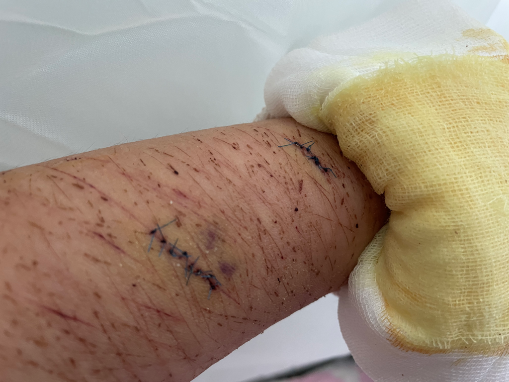 7바늘, 6바늘 꿰맨 상처로 보입니다. 자해 등 관련하여 생긴 상처로 보이는데, 의사 외 일반인들이 보실 때에는 다른 긁힌 상처 등과 구분이 힘들 수 있습니다.