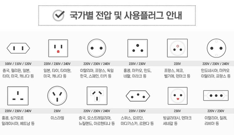 일단 많이쓰는 전압이 220, 110으로 크게 다르고 콘센트도 제각각입니다. 보통 해외여행시는 멀티 콘센트하나 구비하시면 전세계 다 연결은 다 가능하다 보면됩니다. 전압은 고려해야되는데 장비에 겸용전압인지 확인하시면 됩니다.