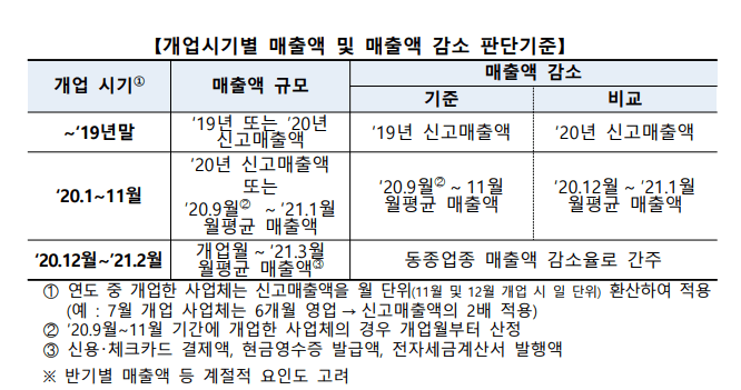 질문하신 내용에 대하여 아래와 같이 답변 드립니다.보통 19년 10월에 오픈을 하여 3개월치의 매출만 발생한 경우 그 3개월 매출로 판단하기보다는 3개월 매출을 12개월 매출로 환산하여 비교하는 것이며, 기타 재난지원금과 관련한 자세한 내용은 세무/회계와 무관하고 세법 상 지급되는 부분도 아니기 때문에 관할 기관에 직접 문의해주시기 바랍니다.