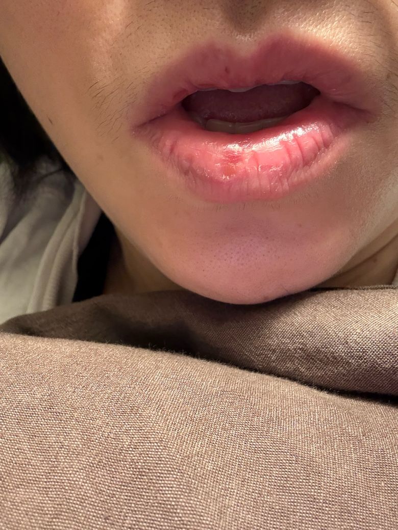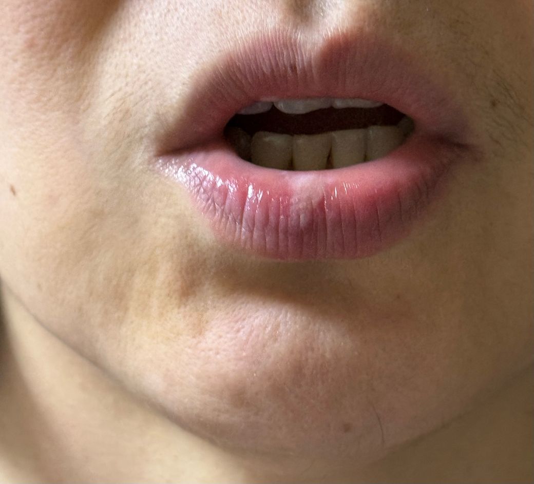 사진상 병변은 하순에 국한된 표재성 2도 화상(superficial partial-thickness burn)으로 보입니다. 수포가 형성되었다가 상피가 벗겨진 뒤 재상피화가 진행 중인 단계로 판단되며, 현재 뚜렷한 화농성 삼출, 심한 부종, 진행성 홍반은 관찰되지 않습니다. 전신 발열이나 림프절 종대가 없다면 임상적으로 감염 소견은 낮아 보입니다.