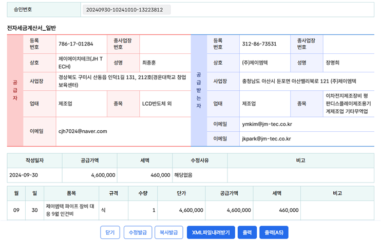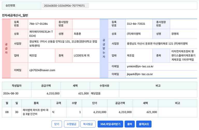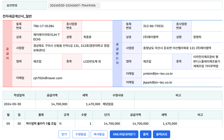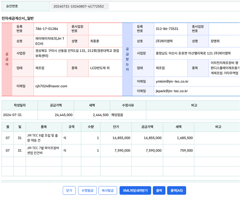 올해 5월부터 10월말까지 조립 및 셋업위주로 진행하였고 계산서도 발행하였습니다.
