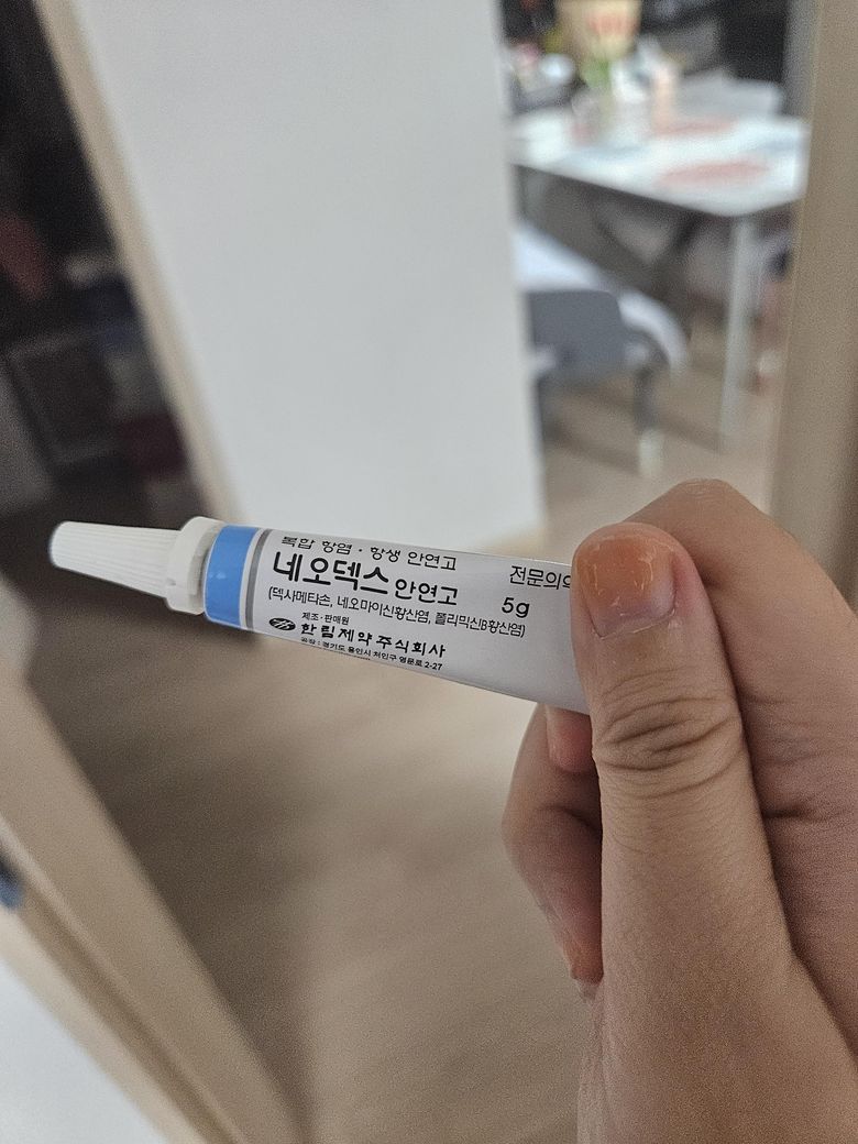 사진속 연고 네오덱스 안연고는 눈 전용 항생제 연고로 손가락 염증에는 사용을 권장하지는 않습니다. 눈에 사용하는 제품은 흡수도와 제형이 달라 피부에 바르면 자극이나 부작용우려가 있어요 손가락 염증엔 피부용 항생제 연고를 사용하는 것이 안전합니다!해당 연고는 눈에 바르는 안 연고로 일반적인 상처가 났을 때 바르는 연고와는 다르고 항생제 연고이긴 하지만 눈은 눈 이외에 상처에 적합한 항생제는 아니라고 판단됩니다.