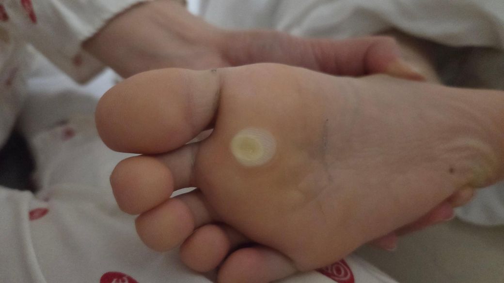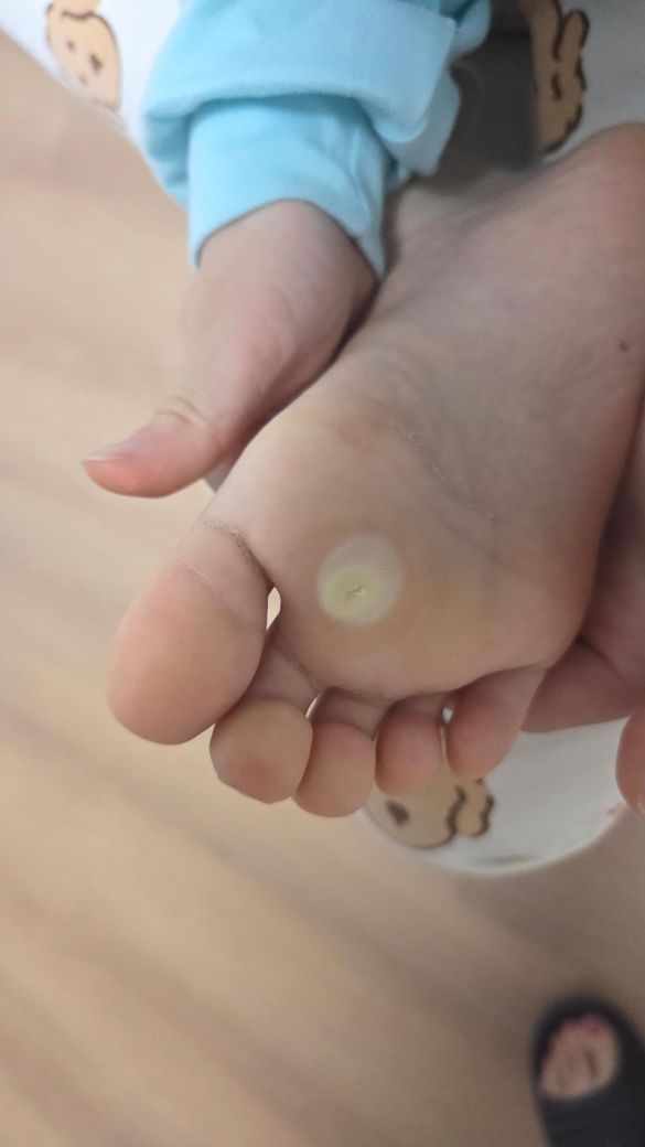 사진상 중심부 각질핵과 주변의 하얗게 불은 피부는 티눈밴드(살리실산)에 의해 각질이 연화된 전형적인 반응으로 보이며, 이 자체는 비정상 소견이라기보다 약제 효과에 가깝습니다. 다만 소아 발바닥 병변은 티눈보다 사마귀가 더 흔하기 때문에 감별이 필요합니다. 사마귀는 피부선이 끊기고 점상 출혈이 보이거나 옆에서 눌렀을 때 통증이 특징이고, 티눈은 중심 핵이 뚜렷하며 수직 압박 시 통증이 더 두드러집니다. 현재 “더 단단해진 느낌”은 중심 각질핵 또는 사마귀 조직이 남아 있어서일 가능성이 있습니다.