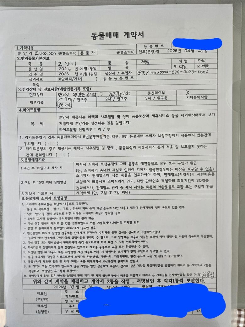 계약서에는 ‘라이트분양’이라 하여 질병 및 보상 관련 책임이 제한된 내용이 포함되어 있었습니다.