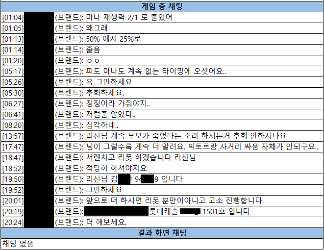 게임사로 부터 받은 개인 채팅 내역과 4~20분 가량 진행된 욕설이지만