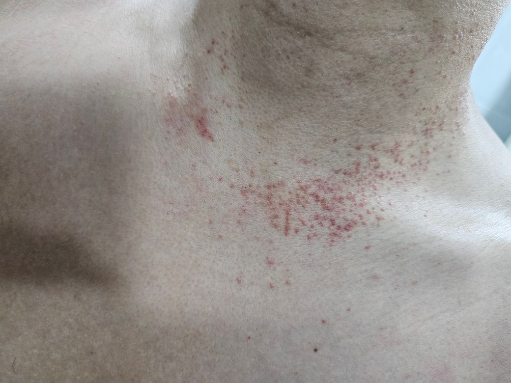 ■ 3/27 외래진료 (제산제, 진해거담제, 마약성진통제 처방), 목부분 아토피 혹은 땀띠 느낌으로 발진(피부색, 소양감)-마지막 사진은 최근 양상